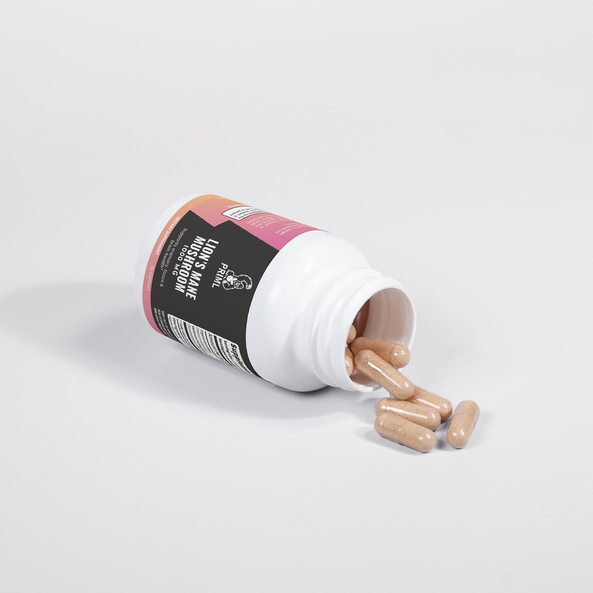 Ingredients: Organic Lion’s Mane (Hericum erinaceus) Mushroom Fruiting Body & Mycelium Powder (Standardized to 40% polysaccharides [400mg]), Organic capsule (pullulan, water), organic pea starch.
